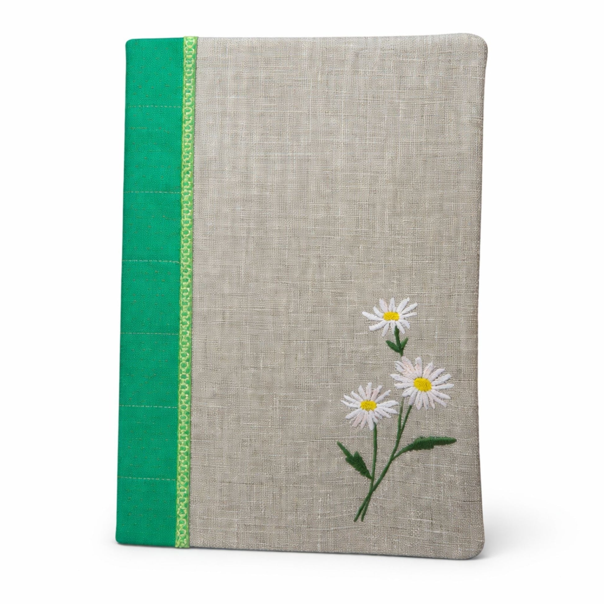 Brighten your stationery collection with this one-of-a-kind A5 notebook cover, featuring a delicate daisy design embroidered in white and yellow threads against a soft beige fabric background. The vibrant green spine panel adds a fresh, modern touch, making it a perfect blend of classic charm and contemporary style. Crafted entirely from high-quality rescued fabric off-cuts, this eco-conscious cover not only showcases sustainable craftsmanship but also ensures each piece is unique.