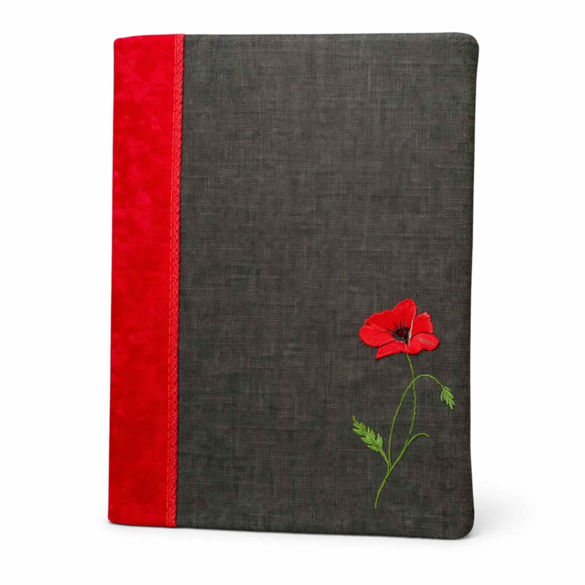 Celebrate the beauty of craftsmanship with our one-of-a-kind A5 notebook cover, adorned with a striking embroidered poppy in bold red and green hues. Set against a charcoal fabric background, this design offers a timeless and understated elegance. The vibrant red spine panel adds a touch of warmth, making it a perfect gift or personal keepsake.