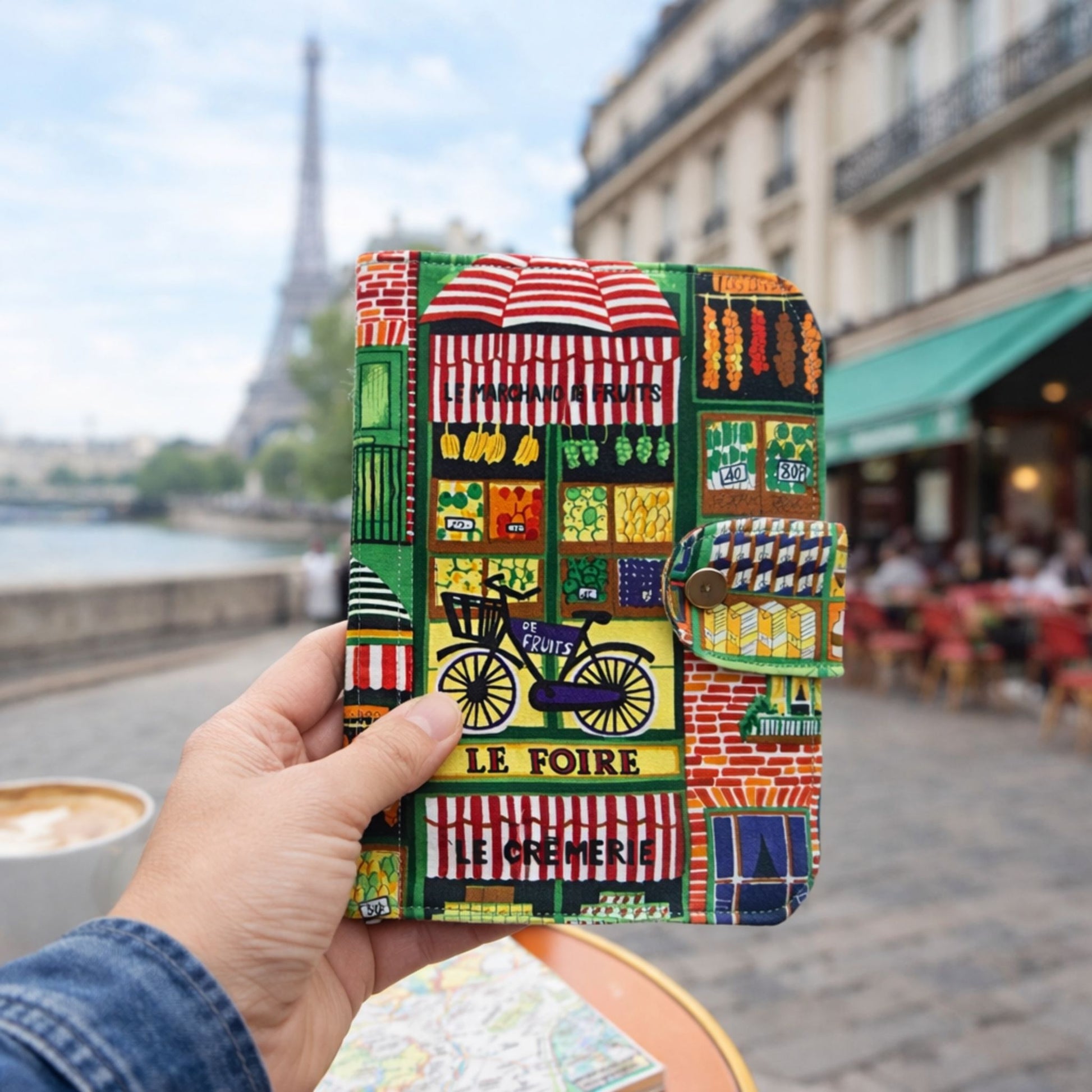 Inspired by traditional French street markets and café culture, this family passport holder travel wallet features a vibrant Paris Market design with illustrated shopfronts, fruit stalls, bicycles, and classic French signage. It brings character and charm to practical travel organisation while keeping everything structured and easy to access.
