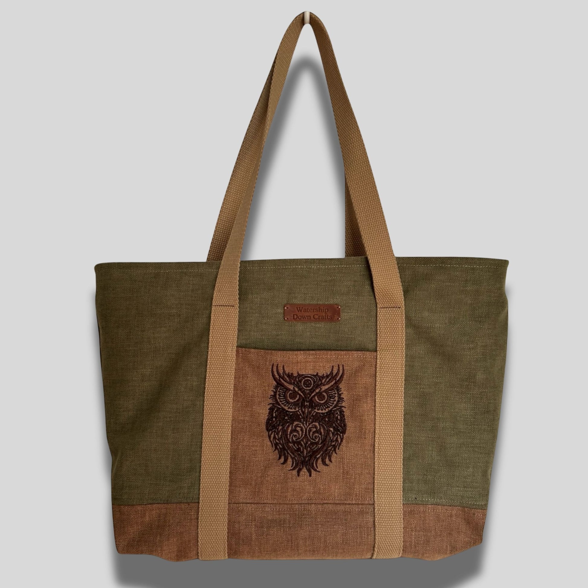Olive Green & Beige Tote Bag with Owl Embroidery – One-of-a-Kind, Zip Top & Shoulder Straps