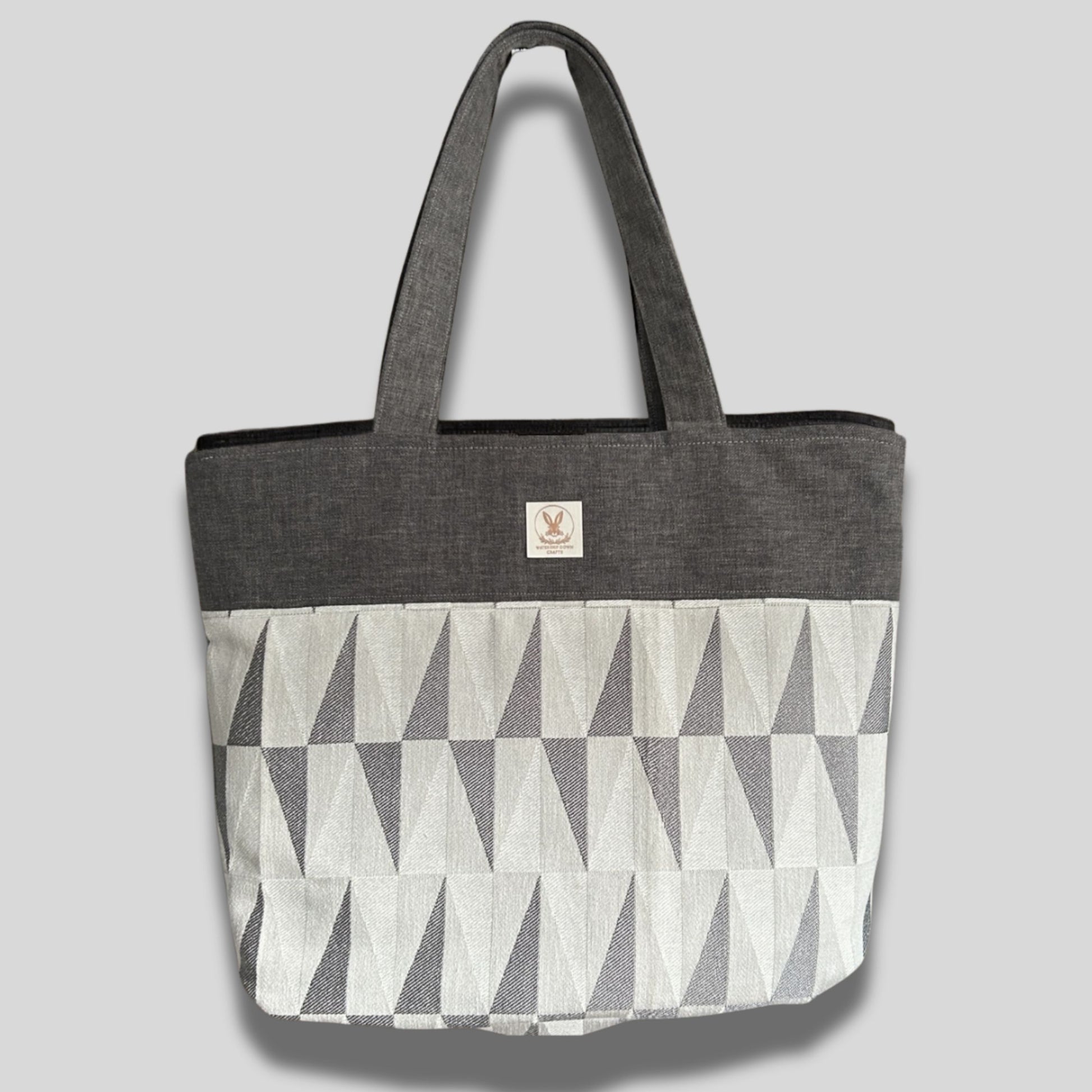 This one-of-a-kind unique fabric tote bag combines modern style with everyday practicality. The two-tone design pairs a dark grey upper section with a striking geometric patterned lower panel, both made from high-quality upholstery off-cuts that give this bag its eco-friendly and sustainable appeal.