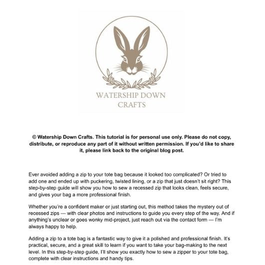Learn how to insert a zip in a bag with this easy, printable tutorial. This PDF teaches you how to sew a recessed zipper into a tote bag with clear instructions and full-colour photos. It’s designed to take the stress out of zips and help you get a neat, professional result even if it’s your first time.