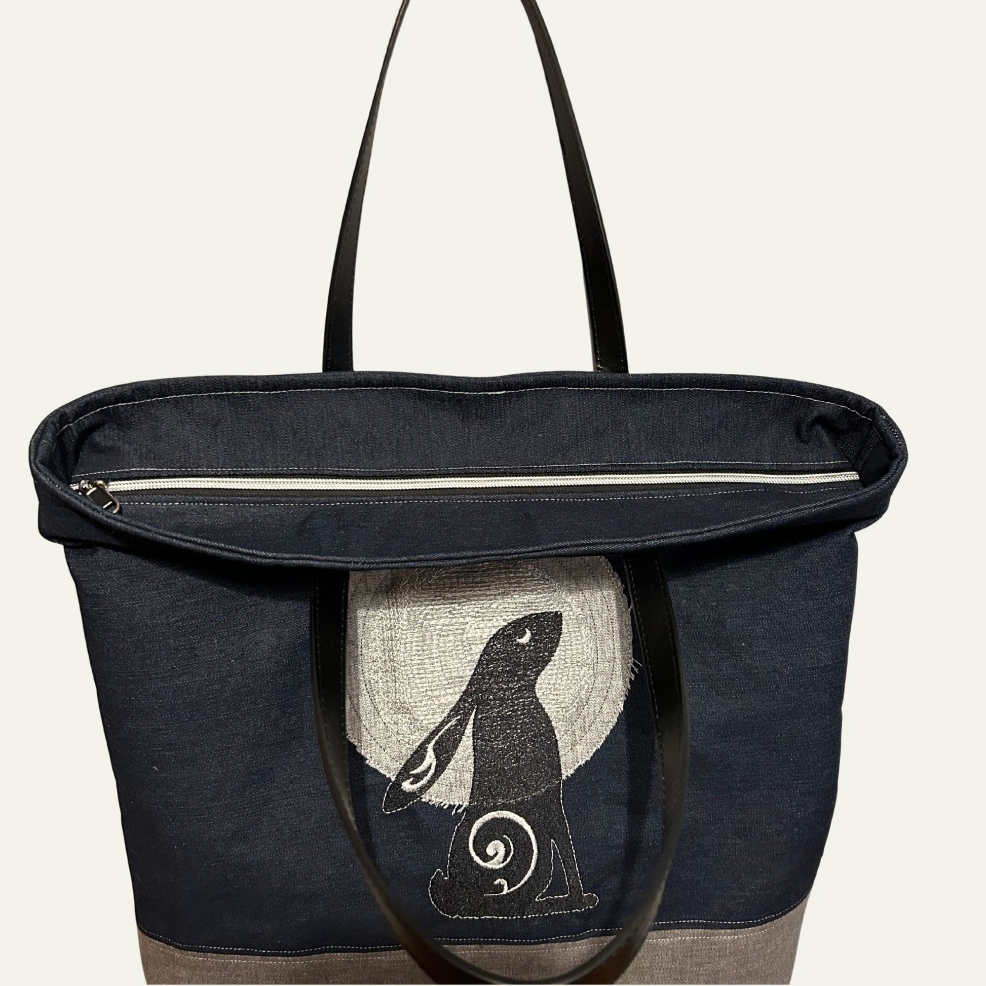 Indigo Denim Moon Gazing Hare Tote Bag – One-of-a-Kind Design