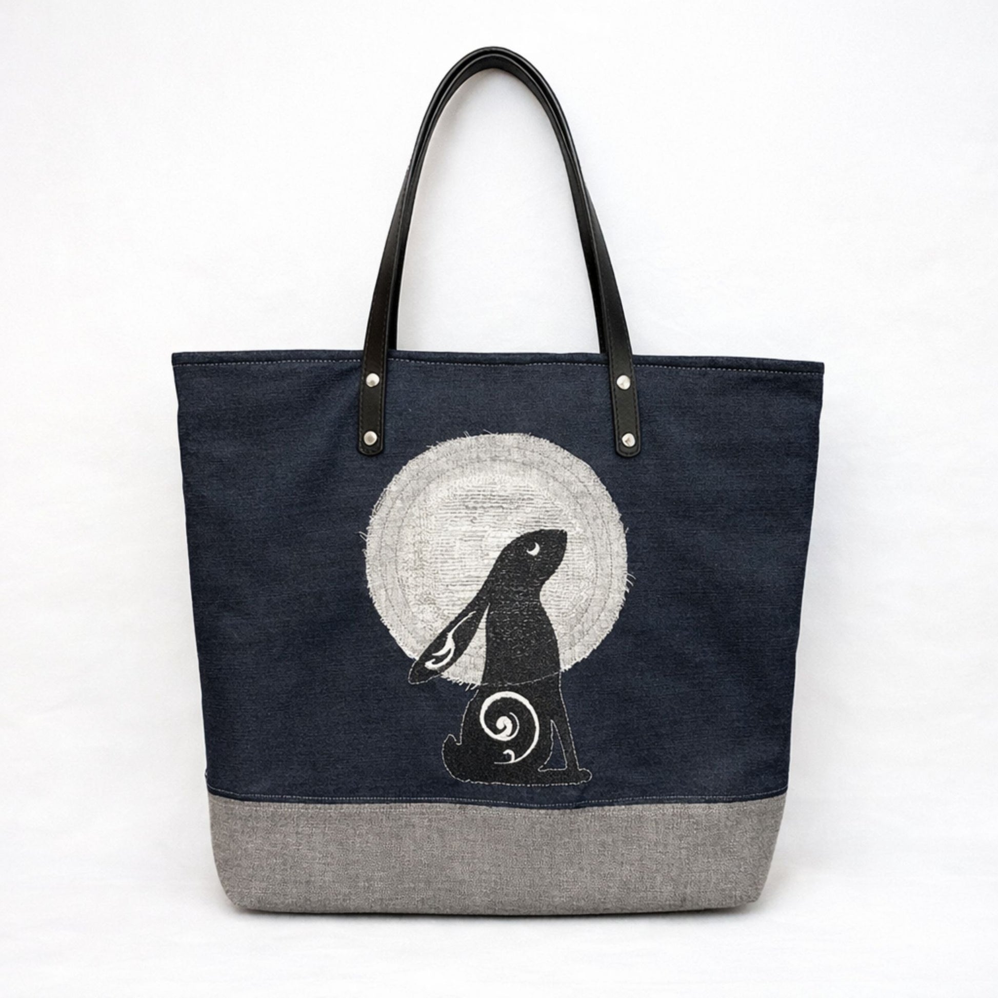This indigo denim tote bag features an appliquéd full moon with an embroidered moon-gazing hare, set against a deep blue denim background with a warm grey base panel. It’s a striking, quietly dramatic design that stands out without shouting.