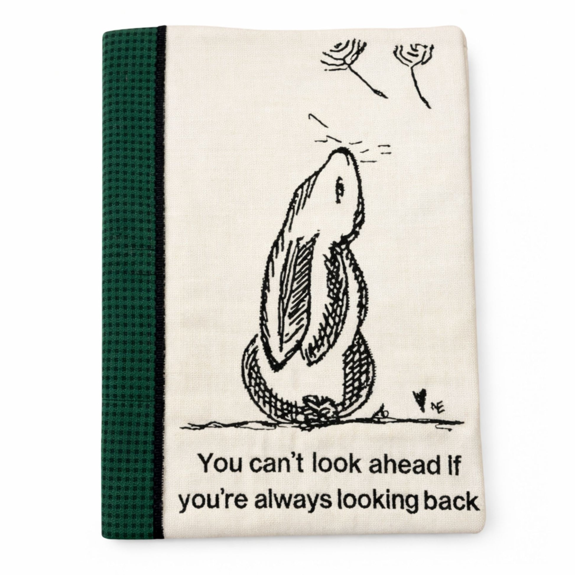 The intricate embroidery showcases a charming rabbit design accompanied by the wise quote, "You can't look ahead if you're always looking back."